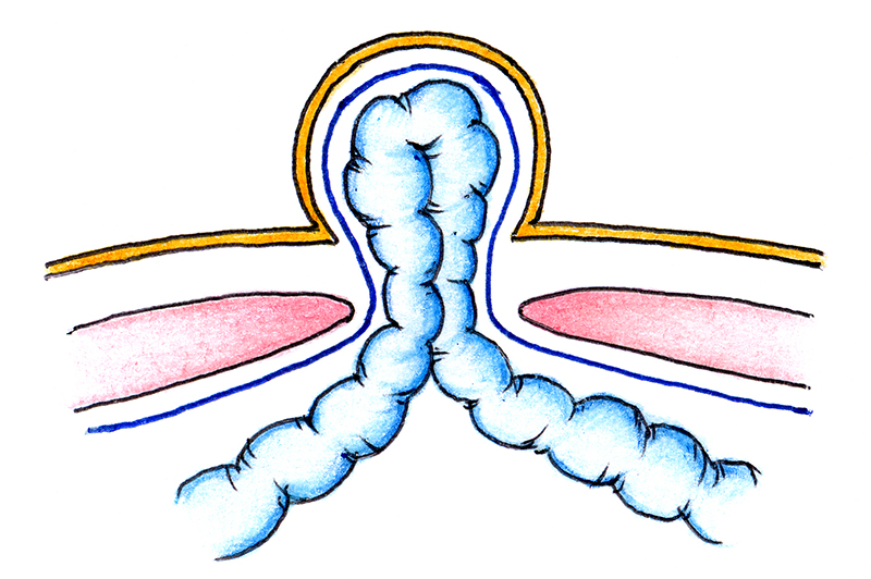 臍ヘルニアは、へその緒がとれるころにでべそになって残ってしまうものです。1歳から2歳までに9割は自然によくなりますが、余った皮膚で臍の形がよくなかったりする場合もときにあります。2歳以降も臍ヘルニアが残る場合は手術をご提案します。